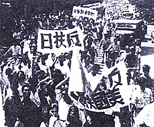 朱自清、金岳霖、张奚若、吴晗等北平各大学教授百余人联名发表宣言,抗议美国扶植日本,并拒绝领取美援面粉。前前后后,各地大学举行盛大游行,并召开《美国扶植日本座谈会》与《反美扶日文艺展览》等。