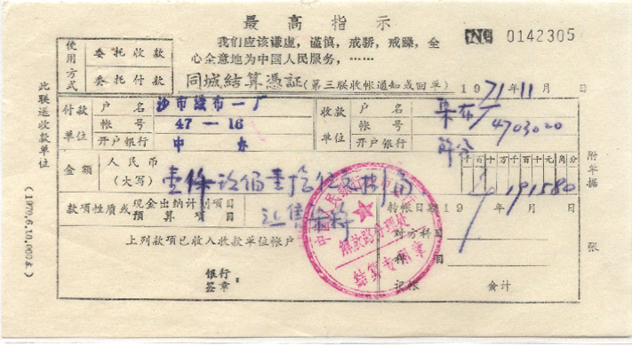 1971年11月01日沙市戳 *