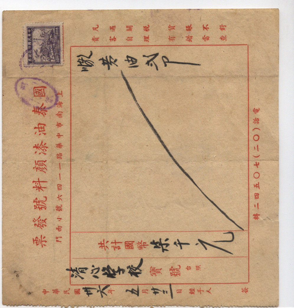 此件独一无二的藏品为年代趣味藏品  ,邮戳为      贴印花税(中华民国)  * 此戳可能尚待精确解析,可联系优先免费核实,更欢迎邮友先进指正补充 联系我们
