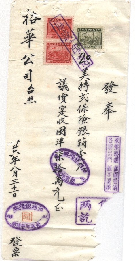 此件独一无二的藏品为年代趣味藏品  ,邮戳为      有印花税票  * 此戳可能尚待精确解析,可联系优先免费核实,更欢迎邮友先进指正补充 联系我们