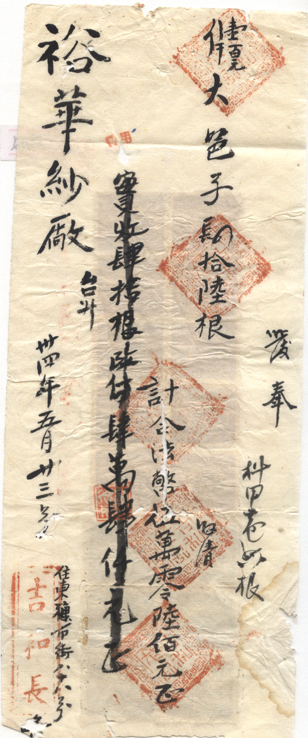 此件独一无二的藏品为年代趣味藏品  ,邮戳为      贴有印花税  * 此戳可能尚待精确解析,可联系优先免费核实,更欢迎邮友先进指正补充 联系我们