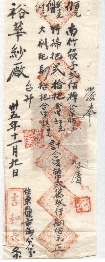 此件独一无二的藏品为年代趣味藏品  ,邮戳为      贴有印花税  * 此戳可能尚待精确解析,可联系优先免费核实,更欢迎邮友先进指正补充 联系我们