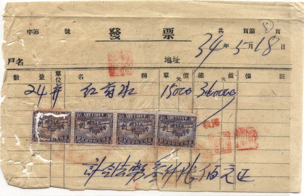 此件独一无二的藏品为年代趣味藏品  ,邮戳为      贴有印花税  * 此戳可能尚待精确解析,可联系优先免费核实,更欢迎邮友先进指正补充 联系我们
