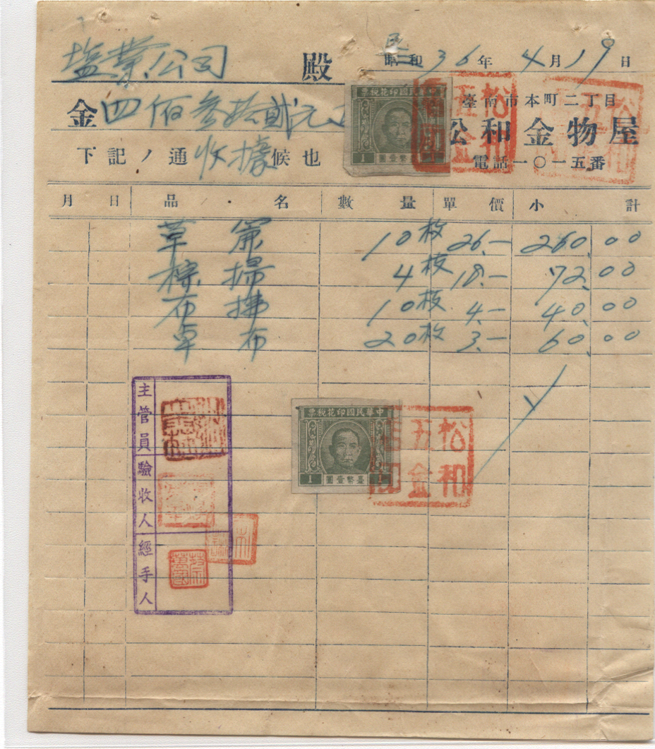 此件独一无二的藏品为年代趣味藏品  ,邮戳为      贴有印花税  * 此戳可能尚待精确解析,可联系优先免费核实,更欢迎邮友先进指正补充 联系我们