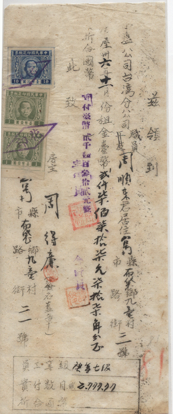 此件独一无二的藏品为年代趣味藏品  ,邮戳为      贴有印花税票  * 此戳可能尚待精确解析,可联系优先免费核实,更欢迎邮友先进指正补充 联系我们