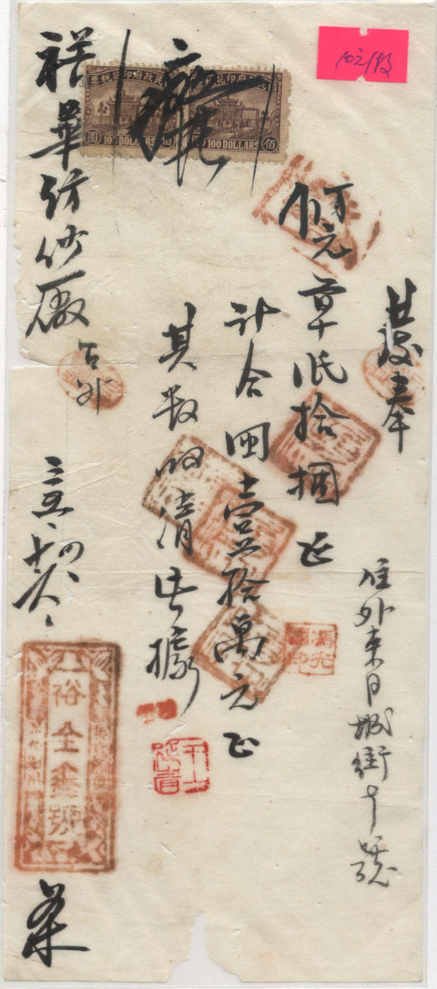 此件独一无二的藏品为年代趣味藏品  ,邮戳为      贴有印花税票  * 此戳可能尚待精确解析,可联系优先免费核实,更欢迎邮友先进指正补充 联系我们
