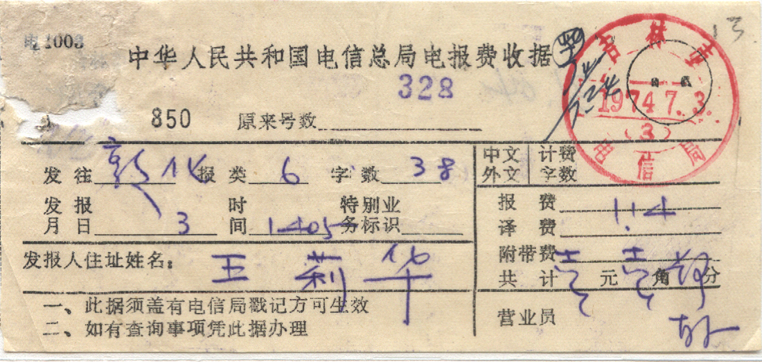 1974年07月03日吉林戳 *