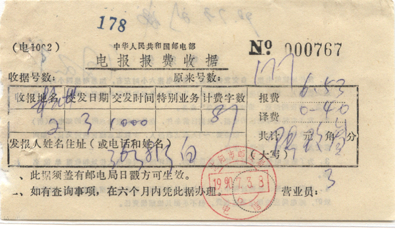 1990年07月03日沈阳戳 *
