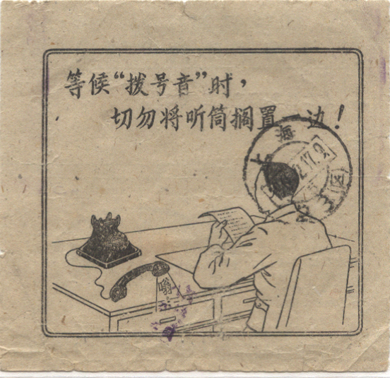 此件独一无二的藏品为年代趣味藏品  ,邮戳为      附图说明接电话注意事项,正面有其它戳  * 此戳可能尚待精确解析,可联系优先免费核实,更欢迎邮友先进指正补充 联系我们