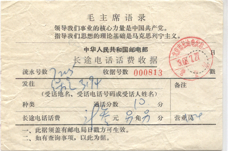 | 北京 | 北京市长途电信局营业室 | | | 全戳邮票 |