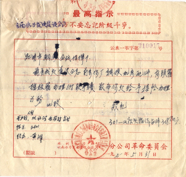 【 云南省 -- 水力发电建设公司革命委员会毛家村工程领导小组 --办公室 】