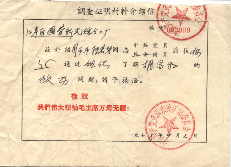 | 二七区 | 武汉市二七区新光综合厂(支)部委员会 | | | 全戳邮票 |