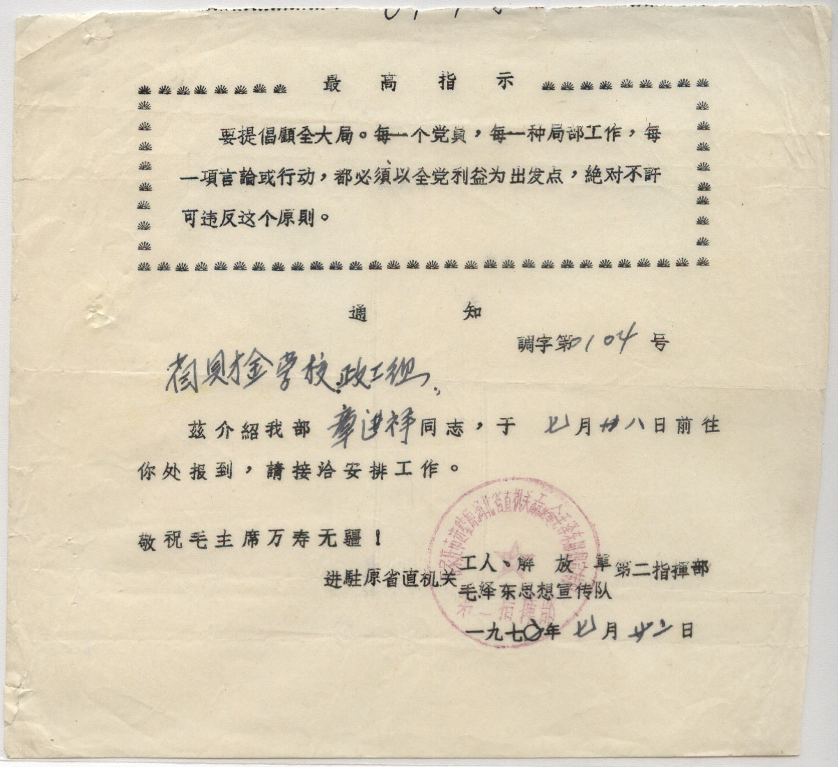 此件独一无二的藏品为年代趣味藏品  ,邮戳为      有最高指示  * 此戳可能尚待精确解析,可联系优先免费核实,更欢迎邮友先进指正补充 联系我们
