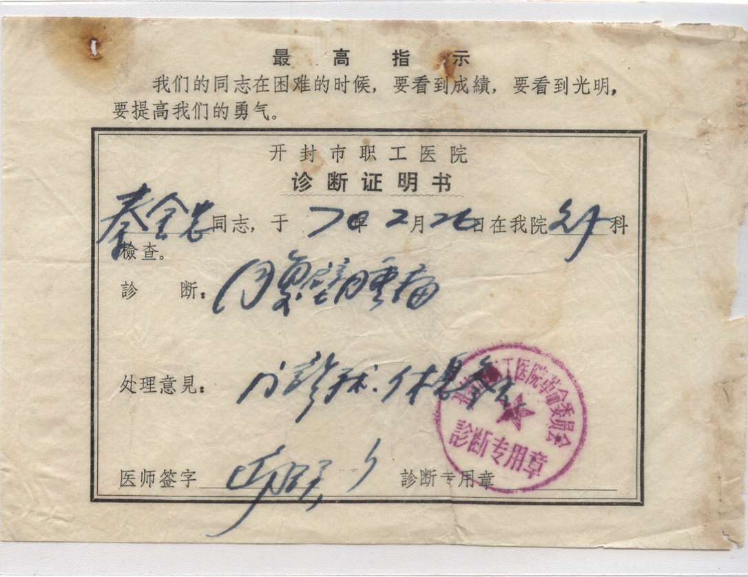 此件独一无二的藏品为年代趣味藏品  ,邮戳为      盖有开封市职工医院革命委员会诊断专用章  * 此戳可能尚待精确解析,可联系优先免费核实,更欢迎邮友先进指正补充 联系我们