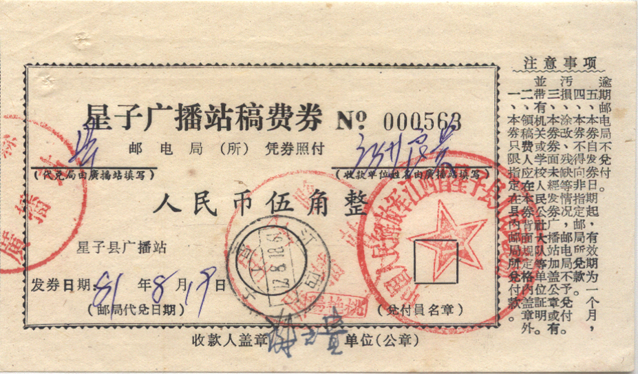 此件独一无二的藏品为年代趣味藏品  ,邮戳为      邮局凭券付费,另盖有广播站章,及中国人民解放军江西省星子县人民武装部章  * 此戳可能尚待精确解析,可联系优先免费核实,更欢迎邮友先进指正补充 联系我们
