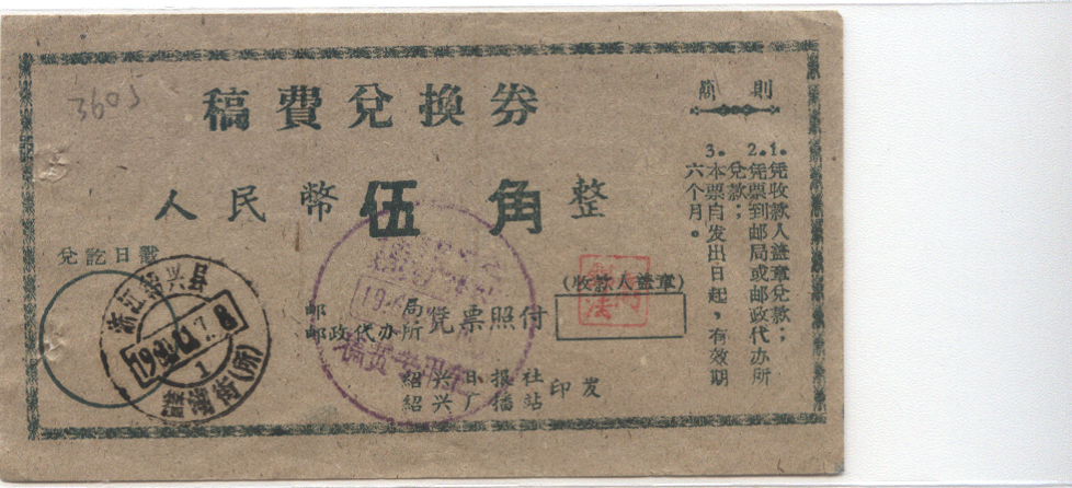 此件独一无二的藏品为年代趣味藏品  ,邮戳为      邮局凭券付费,盖有广播站稿费专用的章  * 此戳可能尚待精确解析,可联系优先免费核实,更欢迎邮友先进指正补充 联系我们