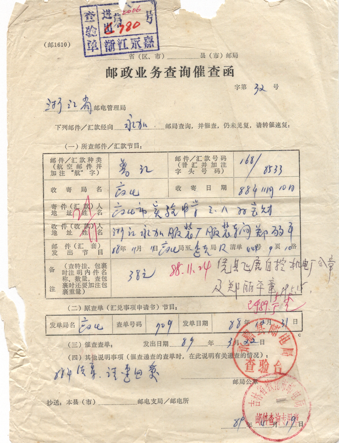 【 吉林省敦化市邮电局 -- 邮件查询专用章 -- 】