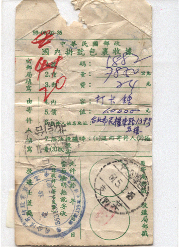 此件独一无二的藏品为年代趣味藏品  ,邮戳为      背面有邮票(台湾票)  * 此戳可能尚待精确解析,可联系优先免费核实,更欢迎邮友先进指正补充 联系我们