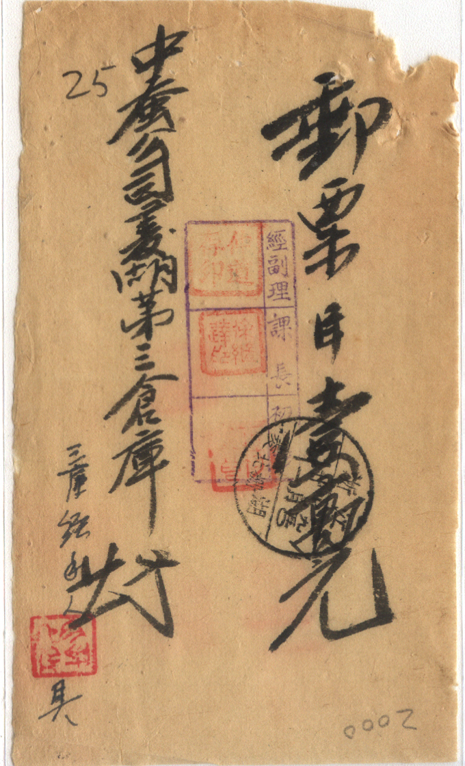 此件独一无二的藏品为年代趣味藏品  ,邮戳为      手写,加盖三个主管用章及一个个人用章  * 此戳可能尚待精确解析,可联系优先免费核实,更欢迎邮友先进指正补充 联系我们