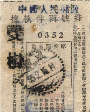 此件独一无二的藏品为年代趣味藏品  ,邮戳为      戳右读,沿用中华邮政收据,加盖中国人民邮政(左读),背面盖有私人章  * 此戳可能尚待精确解析,可联系优先免费核实,更欢迎邮友先进指正补充 联系我们