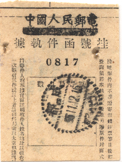 此件独一无二的藏品为年代趣味藏品  ,邮戳为      戳右读,沿用中华邮政,加盖左读的中国人民邮电,背面有附注  * 此戳可能尚待精确解析,可联系优先免费核实,更欢迎邮友先进指正补充 联系我们