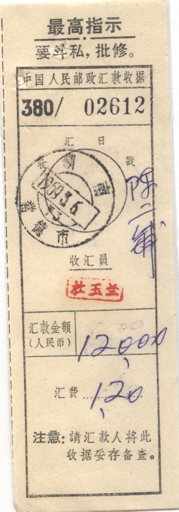 此件独一无二的藏品为年代趣味藏品  ,邮戳为      黑色语录,汇费1.2元  * 此戳可能尚待精确解析,可联系优先免费核实,更欢迎邮友先进指正补充 联系我们