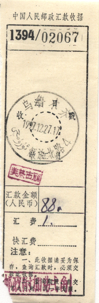 此件独一无二的藏品为年代趣味藏品  ,邮戳为      双语戳,汇费1元,加盖附加费2角  * 此戳可能尚待精确解析,可联系优先免费核实,更欢迎邮友先进指正补充 联系我们
