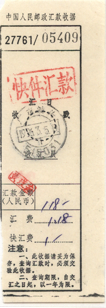 此件独一无二的藏品为年代趣味藏品  ,邮戳为      汇费1.18元,快汇费1元,加盖快件汇款  * 此戳可能尚待精确解析,可联系优先免费核实,更欢迎邮友先进指正补充 联系我们