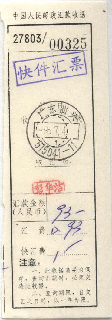 此件独一无二的藏品为年代趣味藏品  ,邮戳为      汇费0.93元,快汇费1元,加盖快件汇票  * 此戳可能尚待精确解析,可联系优先免费核实,更欢迎邮友先进指正补充 联系我们