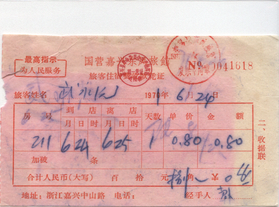 此件独一无二的藏品为年代趣味藏品  ,邮戳为      红色语录,盖嘉兴县革命委员会生产掼挥组章,沿有1970年的票据  * 此戳可能尚待精确解析,可联系优先免费核实,更欢迎邮友先进指正补充 联系我们