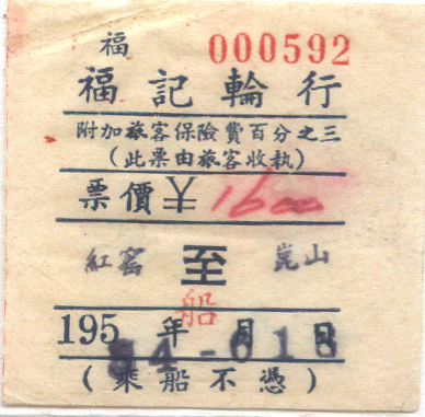 此件独一无二的藏品为年代趣味藏品  ,邮戳为      福记轮行,附加旅客保险费3%  * 此戳可能尚待精确解析,可联系优先免费核实,更欢迎邮友先进指正补充 联系我们