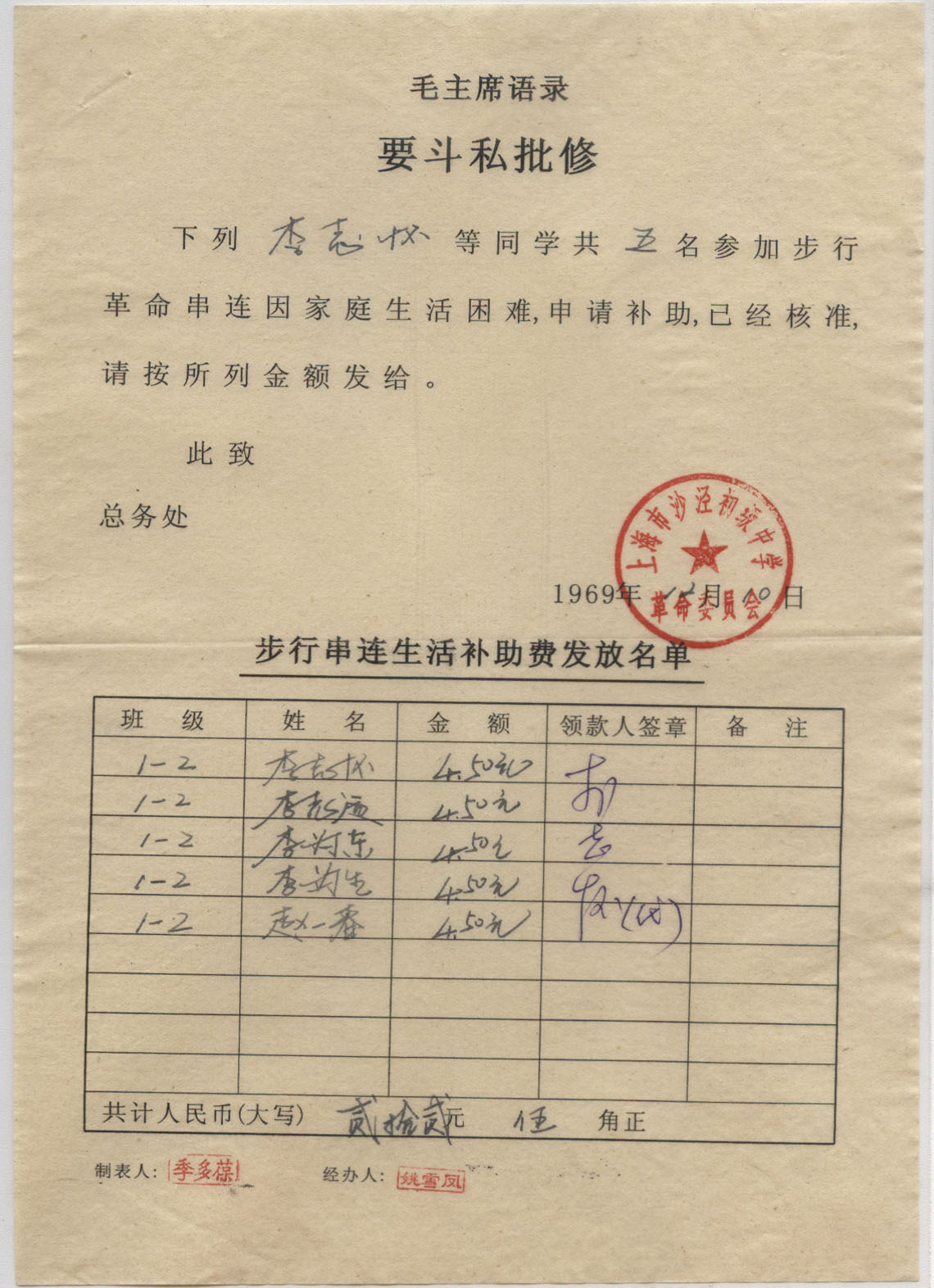 1969年12月10日沙泾初级中学戳 *