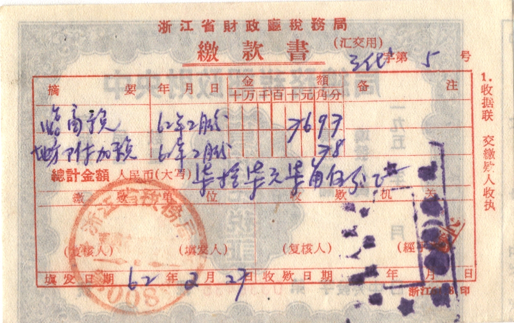 | 浙江 | 浙江省财政税务局 | | | 全戳邮票 |