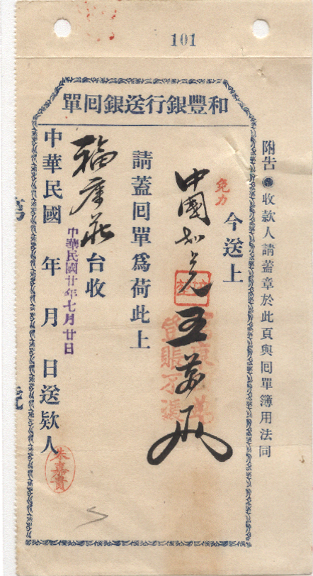 <   1913年07月02日使用于和丰银行的年代趣味藏品 ~ 点图放大