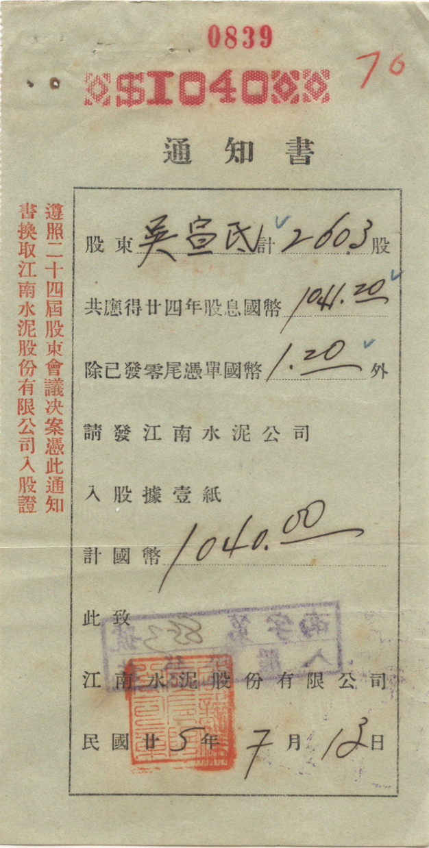 <   1936年07月13日使用于江南水泥厂的年代趣味藏品 ~ 点图放大