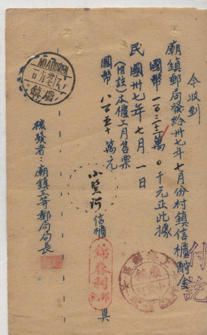<   1948年07月01日使用于庙镇的年代趣味藏品 ~ 点图放大