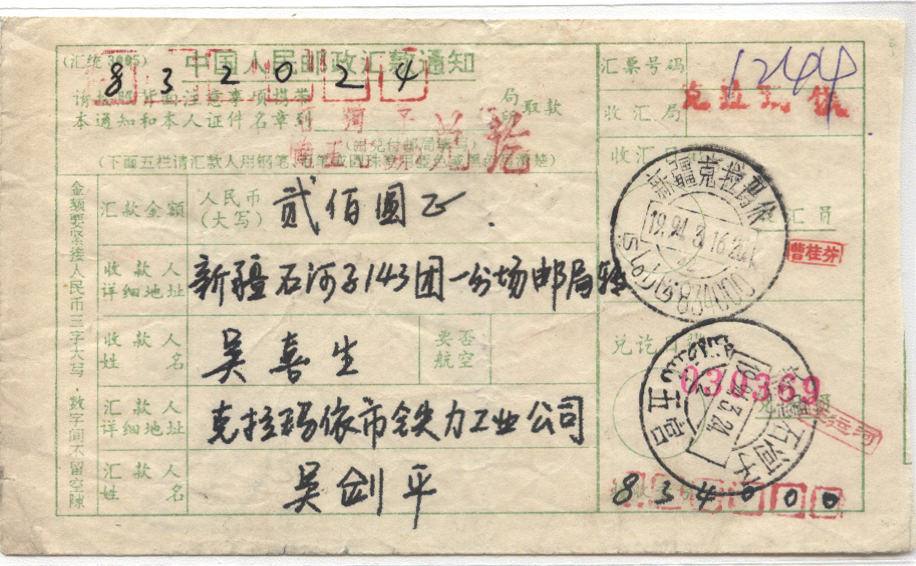 <   1994年03月16日使用于克拉玛依的年代趣味藏品 ~ 点图放大