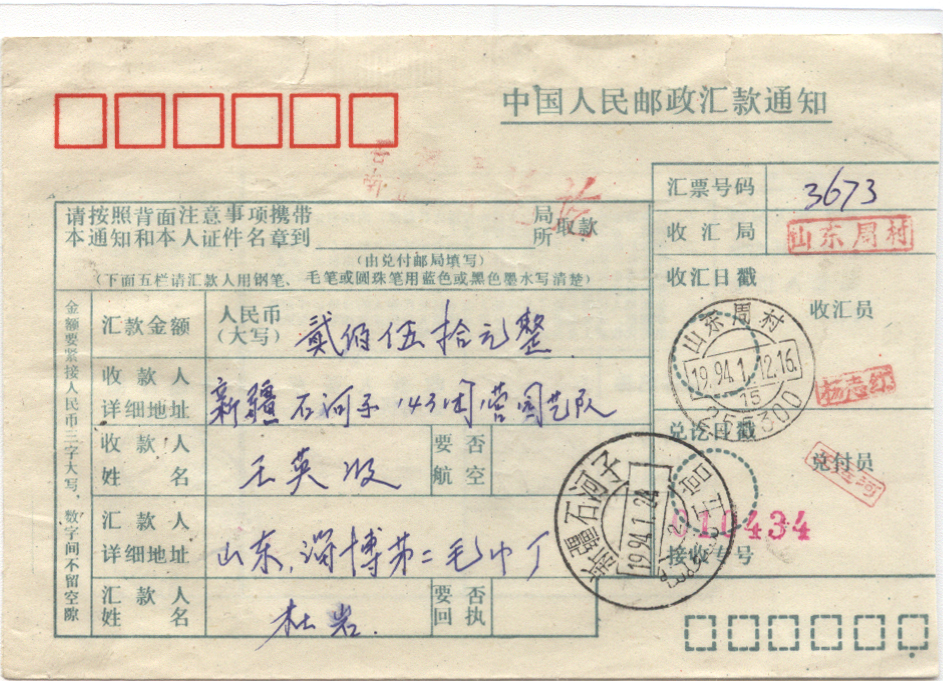 <   1994年01月12日使用于周村的年代趣味藏品 ~ 点图放大