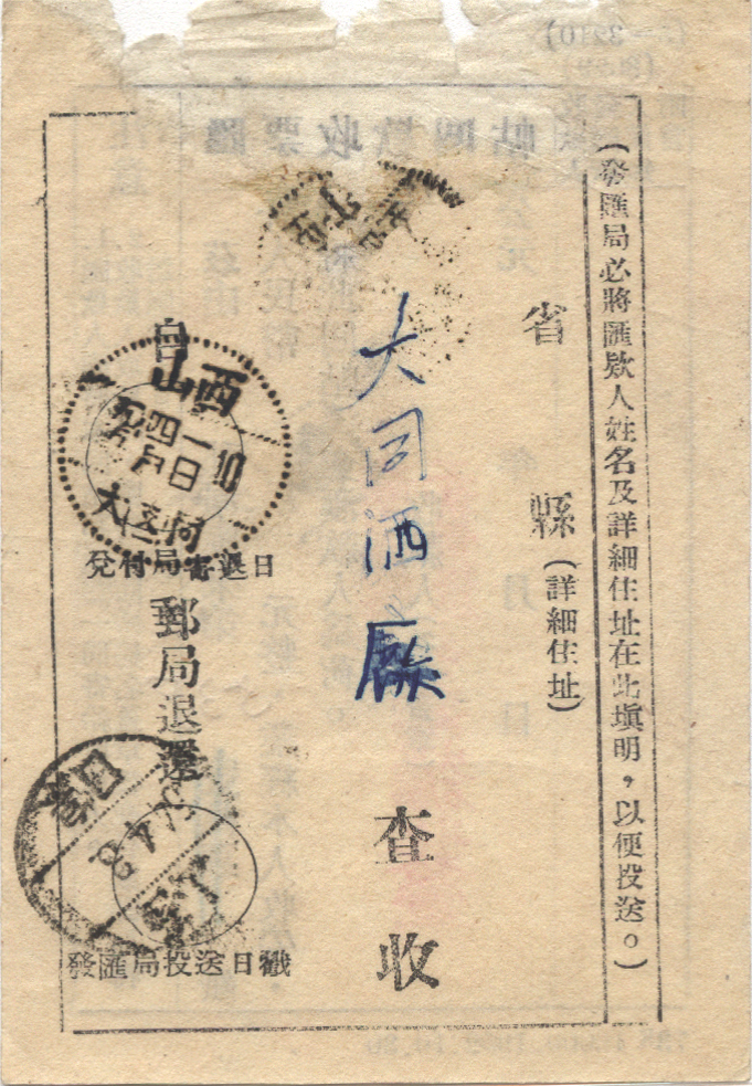 <   1954年04月01日使用于大同的年代趣味藏品 ~ 点图放大