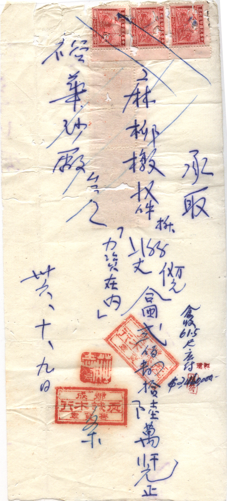 此件独一无二的藏品为年代趣味藏品  ,邮戳为      贴有印花税  * 此戳可能尚待精确解析,可联系优先免费核实,更欢迎邮友先进指正补充 联系我们