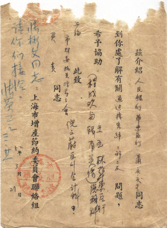 | 增产节约委员会 | 上海市增产节约委员会联络组 | | | 全戳邮票 |