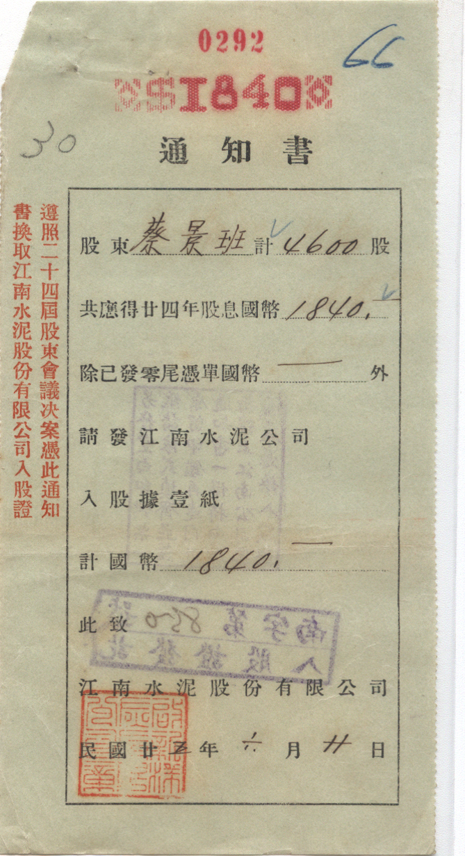 <   1936年06月20日使用于江南水泥厂的年代趣味藏品 ~ 点图放大
