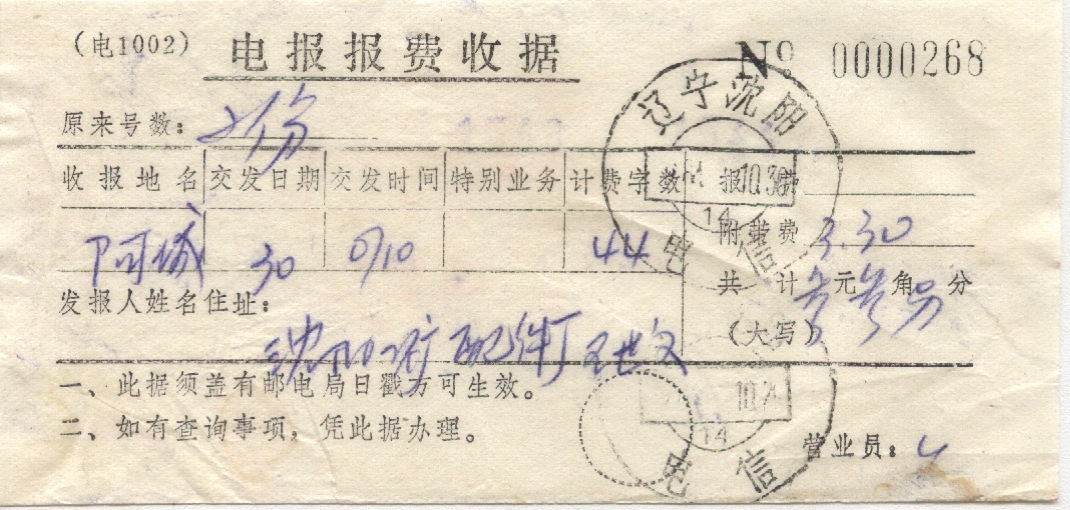 <   1984年10月30日使用于沈阳的年代趣味藏品 ~ 点图放大