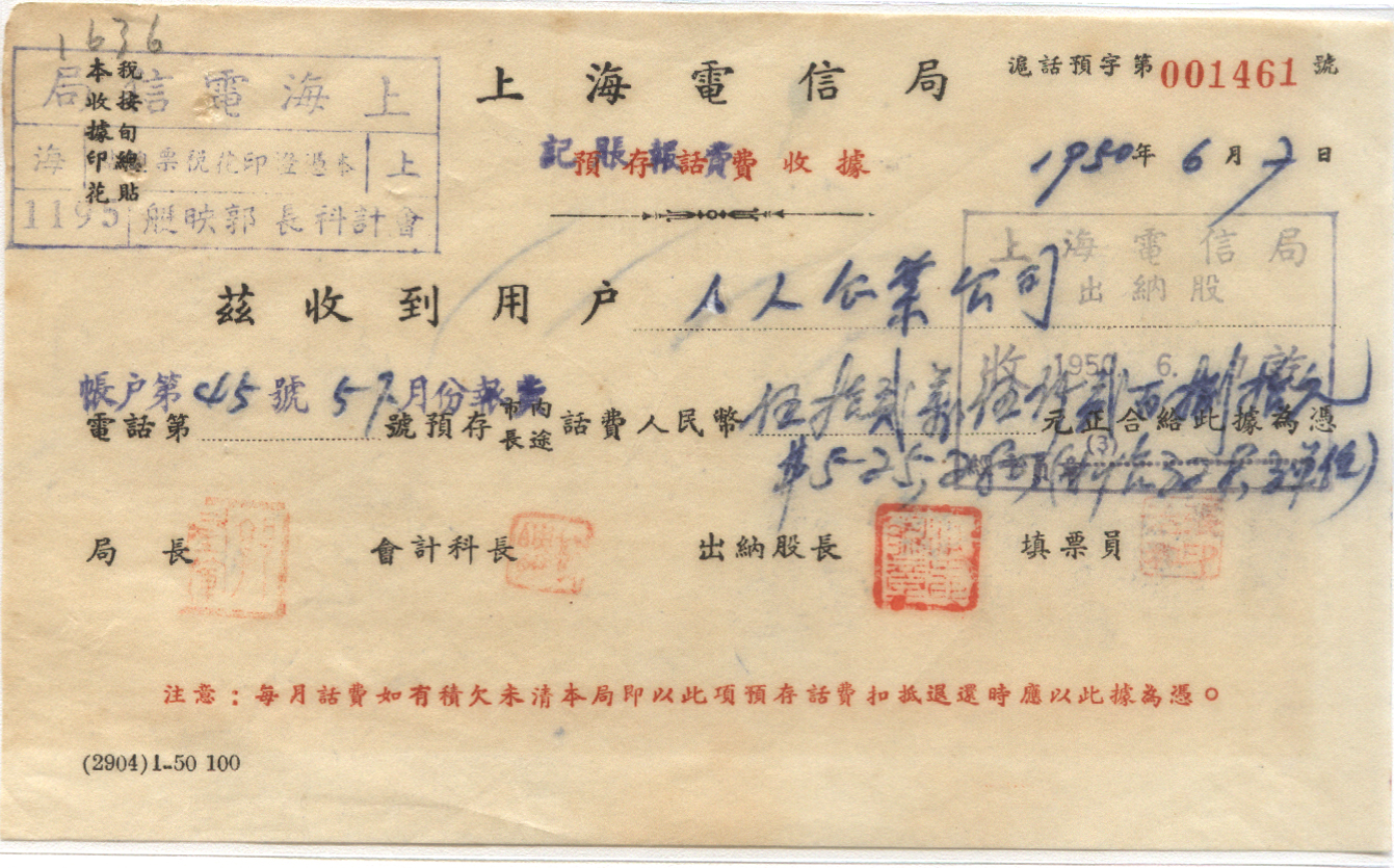 <   1950年06月07日使用于电信局的年代趣味藏品 ~ 点图放大