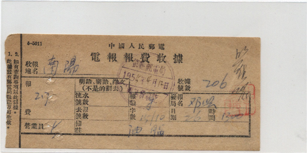 <   1955年04月12日使用于邓县的年代趣味藏品 ~ 点图放大