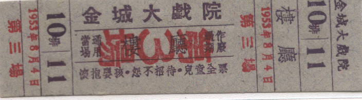 <   1953年08月04日使用于金城大戏院的年代趣味藏品 ~ 点图放大