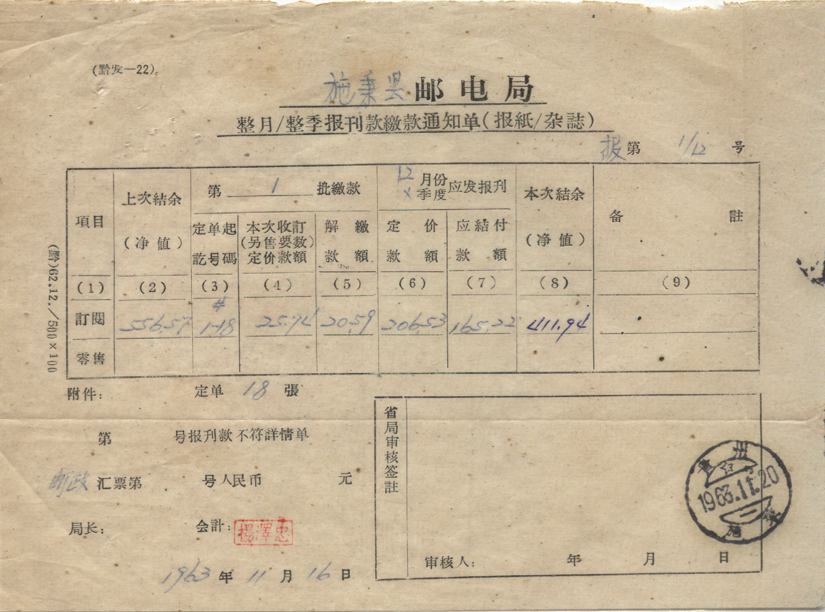 <   1963年11月20日使用于施秉的年代趣味藏品 ~ 点图放大