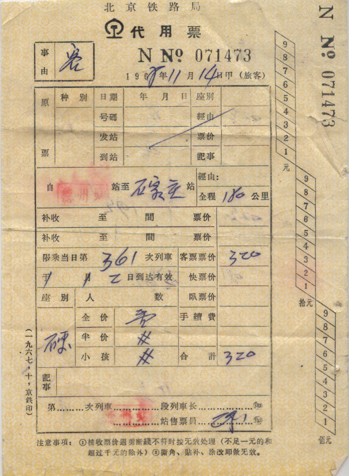 <   1968年11月14日使用于北京铁路局的年代趣味藏品 ~ 点图放大