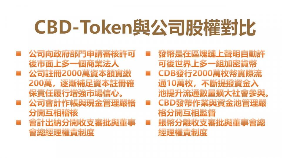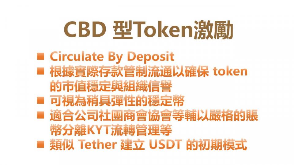 Token 市值管理:採 CBD(Circulate By Deposit)模型,根據實際存款管制流通以確保 Token 市值穩定與組織信譽,保障類似穩定幣儲備制,管理類似公司財會分離。