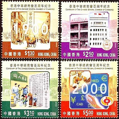 2000年一百周年之际,香港邮政还第一次为一家商会发行了纪念邮票,是为纪104,全套四枚,展现了1900年商会成立、派发赈济基金,及过去用算盘运算到现在高技术的营商模式的变迁。